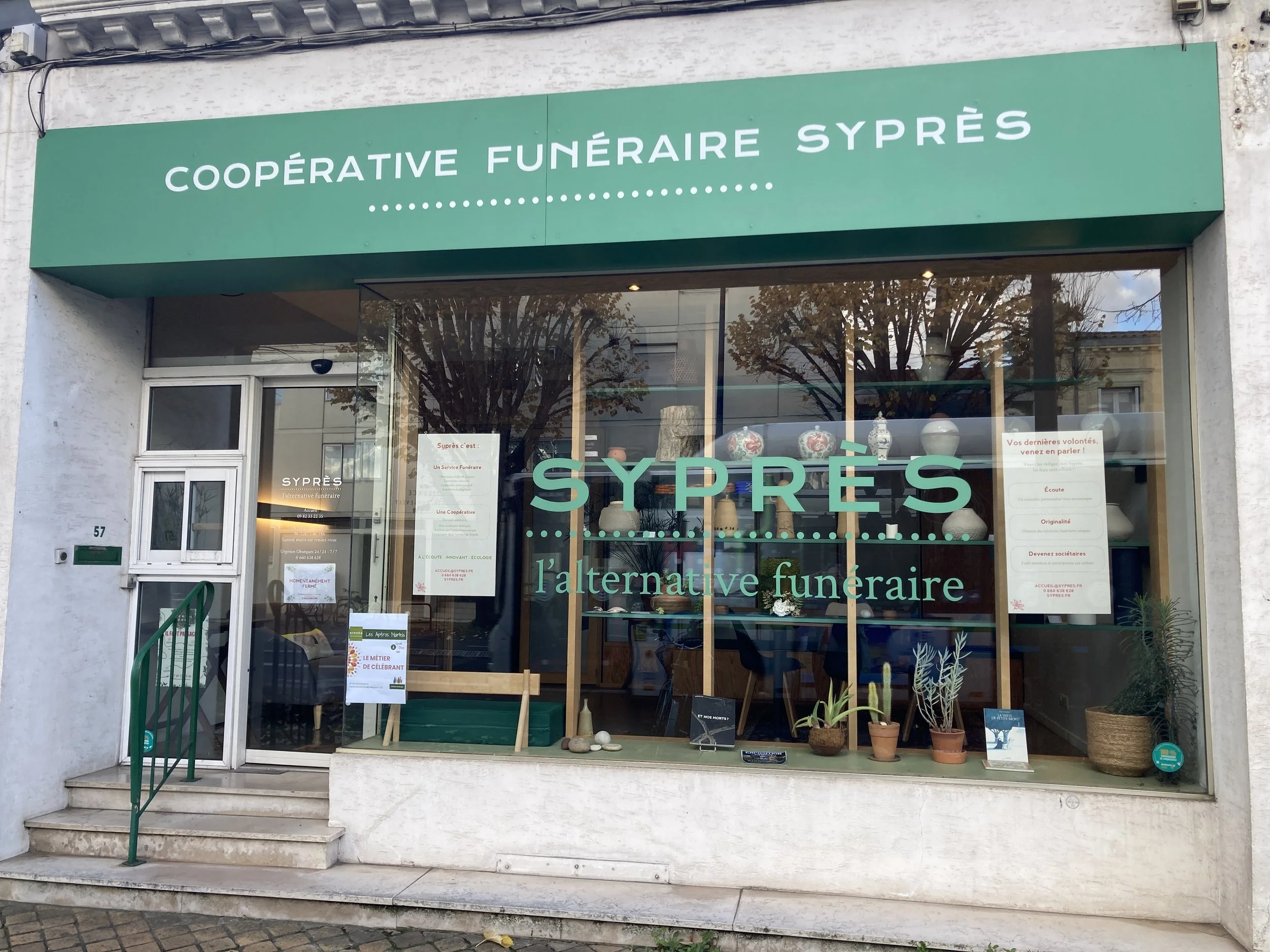 En Octobre dernier, je lis dans la newsletter de mon association de quartier qu’un Café Mortel est organisé en son sein par la coopérative funéraire Syprès dont j’avais déjà repéré la devanture à Talence, intriguée par sa sobriété et sa couleur. Enseigne verte, vitrine mettant en scène une étagère en bois remplie d’urnes funéraires intrigantes, quelques plantes vertes et surtout une énergie zen et tranquille. Il ne m’en a pas fallu plus pour décider de me rendre à cet événement, n’ayant absolument aucune idée de la sauce à laquelle j’allais être mangée… J’ai passé deux heures puissantes, profondes, avec la vague impression de faire partie d’un grand tout. Ce moment était animé et encadré par Edileuza Gallet, psychanalyste, et Yasmina Chaouchi, psychologue. Je suis allée les voir à l’issue de la rencontre pour savoir si elles accepteraient de me raconter le chemin qui les a menées jusqu’à Syprès et la mise en place des ‘Cafés Mortels’ dans la métropole bordelaise.